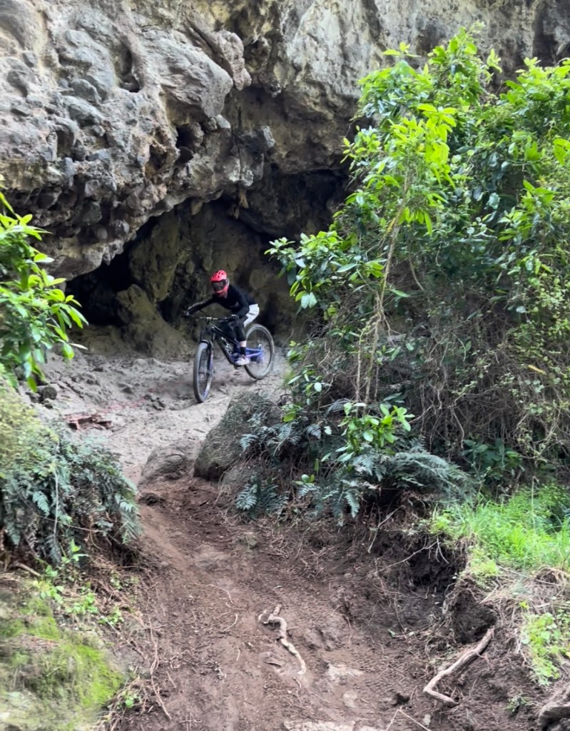 Stage 4 – Locomotion in to Double vision A second steep climb out from the bottom of Victoria Park and back in to the Adventure park took us to the top of Stage 4, and one of my favorite trails of the race. Locomotion was a short straight forward flow trail with a couple of climbs before dropping in to an off camber corner and the start of Double Vision. This is a new trail in the park, with lots of steep dropping corners and a very cool cave feature, which has riders riding through the rocky alcove. Lots of off camber root sections in the bottom section of the trail made it feel more like my home trails of Rotorua, which explains why it was one of my best result of the day in 9th place.