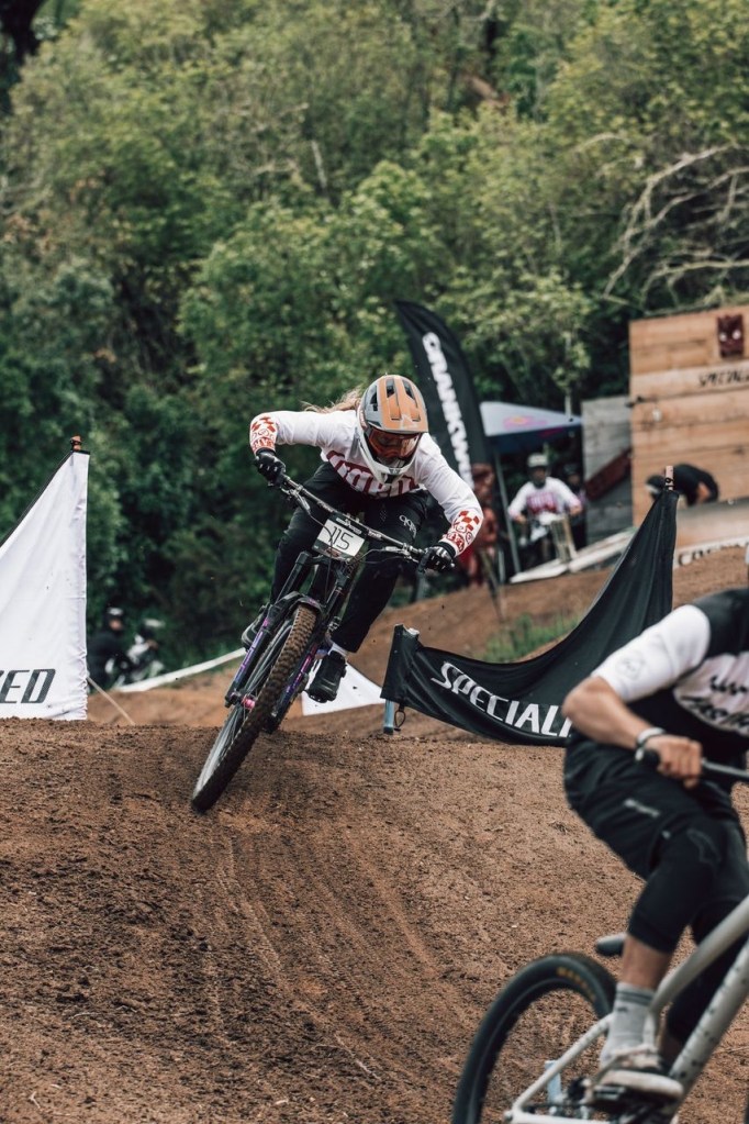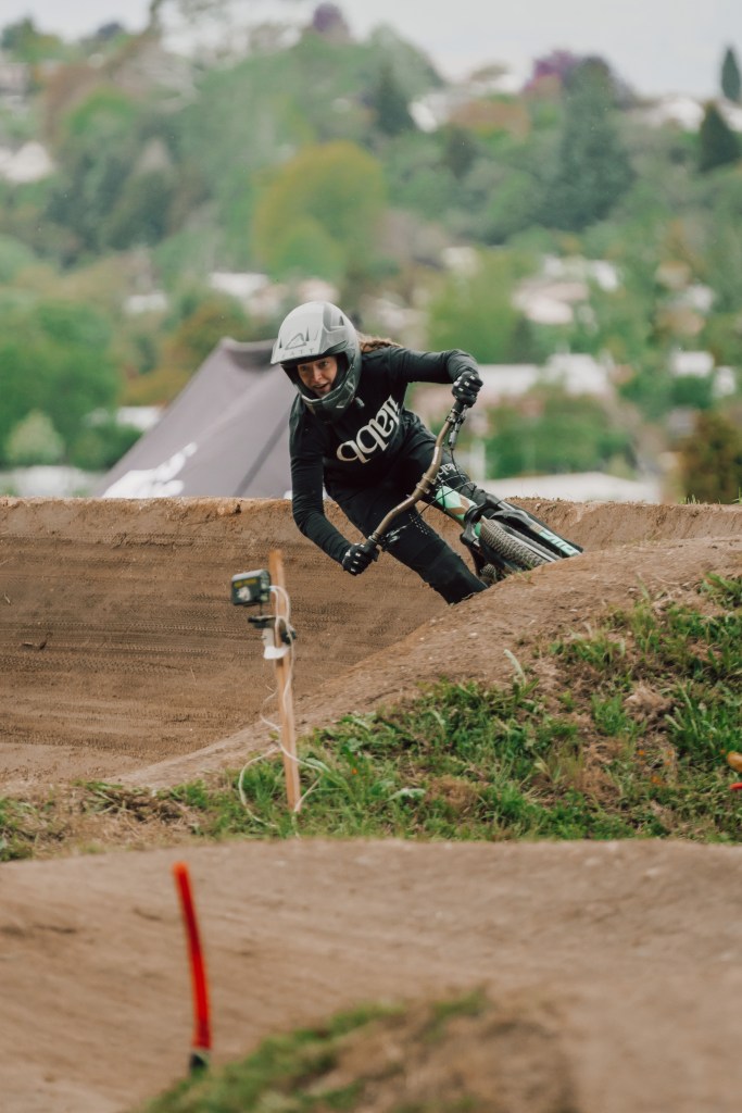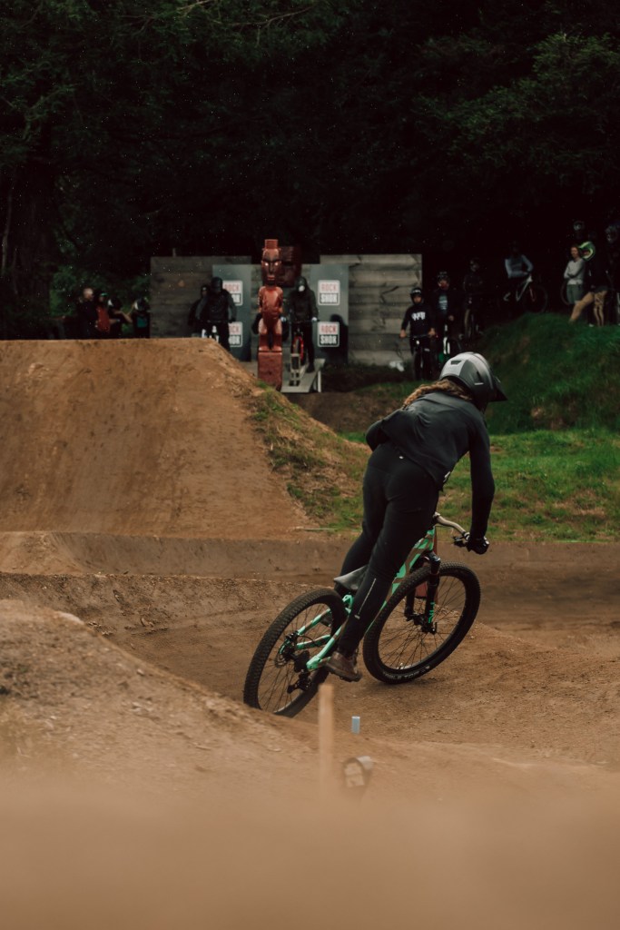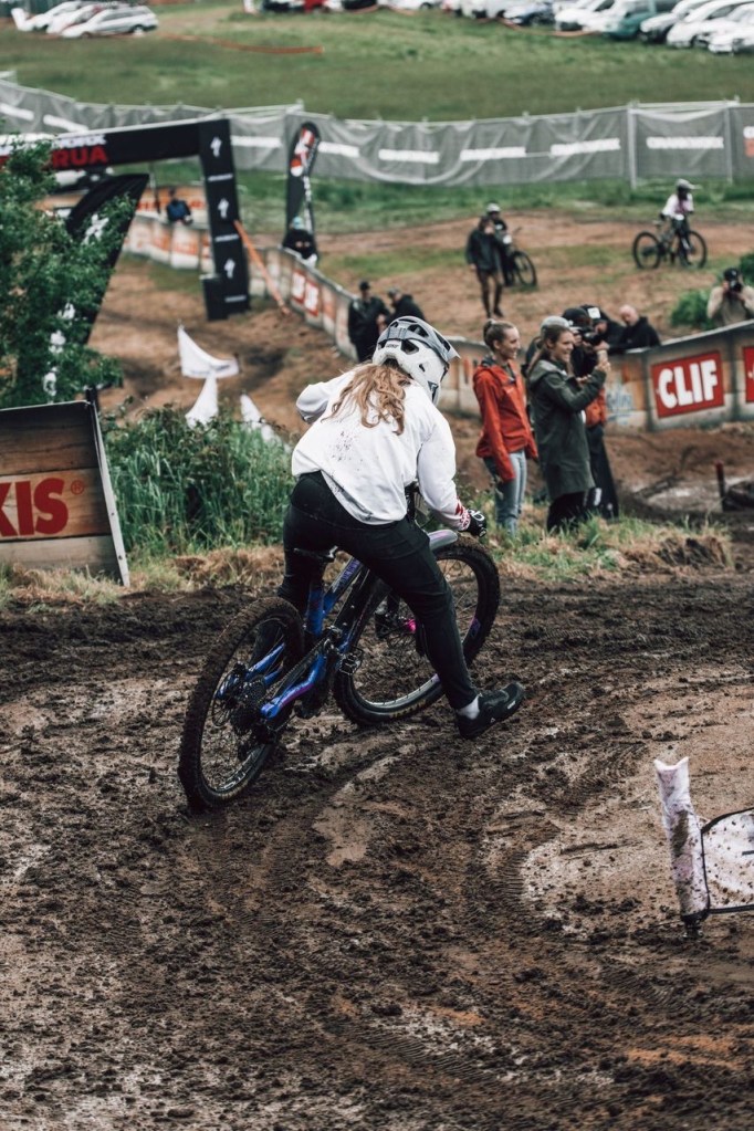 Practice was mostly dry, but with clouds coming in fast we knew the track would change a lot. Heavy rains made the track a lot more greasy, and slippery, slowing down the rolling speed and making all the features a bit more difficult. However this made the whole event so much more fun as a result, with riders sliding all over the place, often facing the wrong way up the track, it was like Bambie on ice. Somehow I didn’t qualify last, but my low qualifying position put me against Kialani Hines, who knocked me out of the round or 16 pretty quickly. She did go on to win the whole race though, so I certainly don’t feel about that.