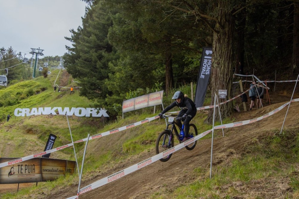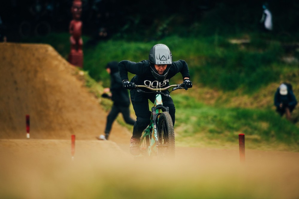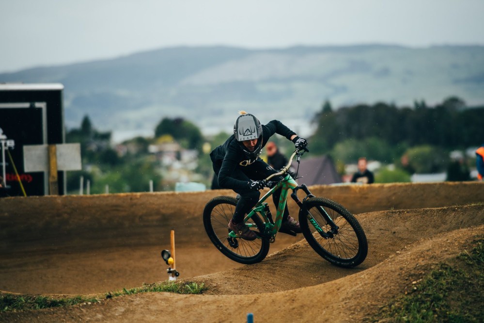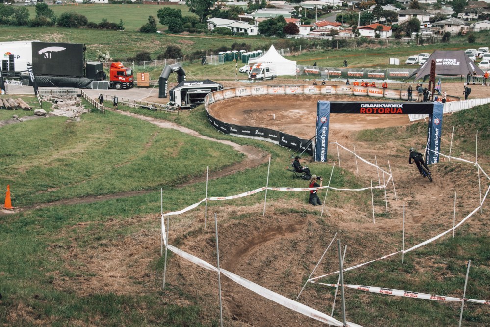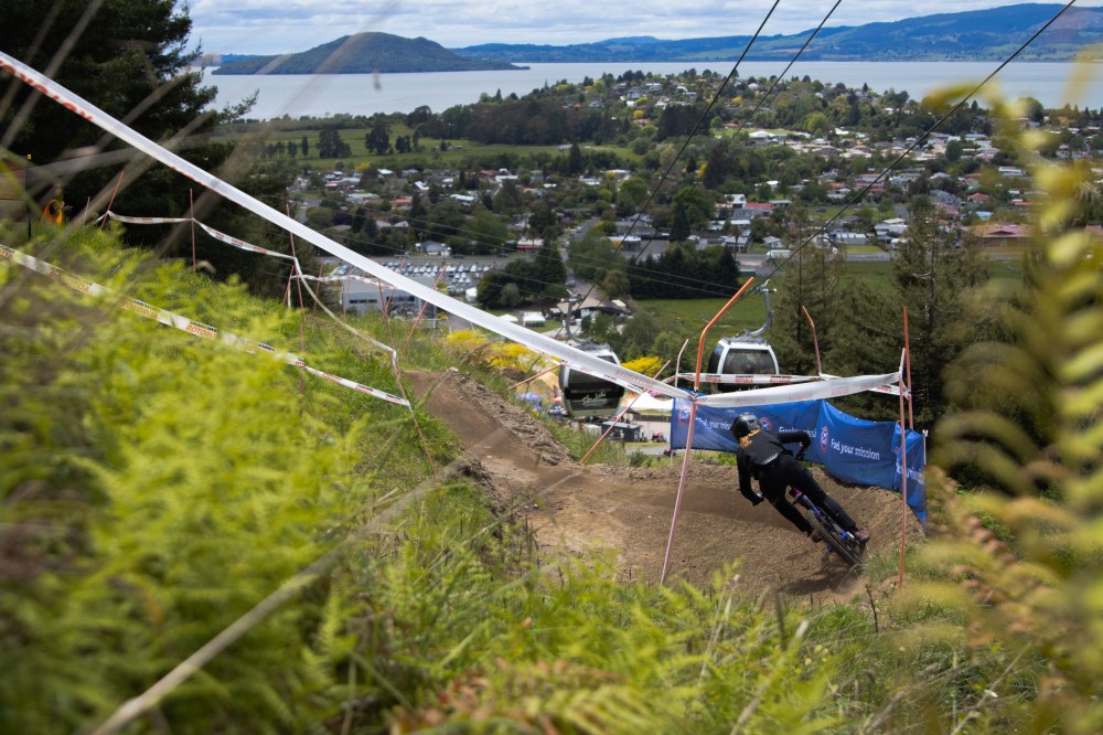 The event kicked off on Tuesday, with a track walk to look at the course being used for the Downhill race. After I had gone through the registration process, provided vaccination details, my race license, and collected my number boards, I jumped in the shuttle to get a lift to the top of the hill. The downhill track starts from the top of Mount Ngongotaha, over looking Lake Rotorua. Once you leave the start gate the top third of the course traverses across wide agricultural fields, with lots of off-camber grassland, with hidden compressions and bumps all the way along. A large scaffolding frame creates a bridge that takes riders over the access road and in to the native forest section. This middle part of the forest is rough and rooty with some big optional drops and jumps. It gets steeper the further down you go, including lots of multiple line options to navigate through sections of very lose dirt, and slippery off-camber roots. Eventually you drop back in the the Skyline bike park, which makes up the bottom third of the course. A couple of big berms, a small rock garden, and a steep wooden bridge, took riders in to what looked like a construction site for the new luge track going in. This then came back on to the steep and rutted grassy trail that runs under the gondola and down towards the finish line. It’s a strange course, which certainly test the skill level of the riders as it seems to have a little bit of everything in it.